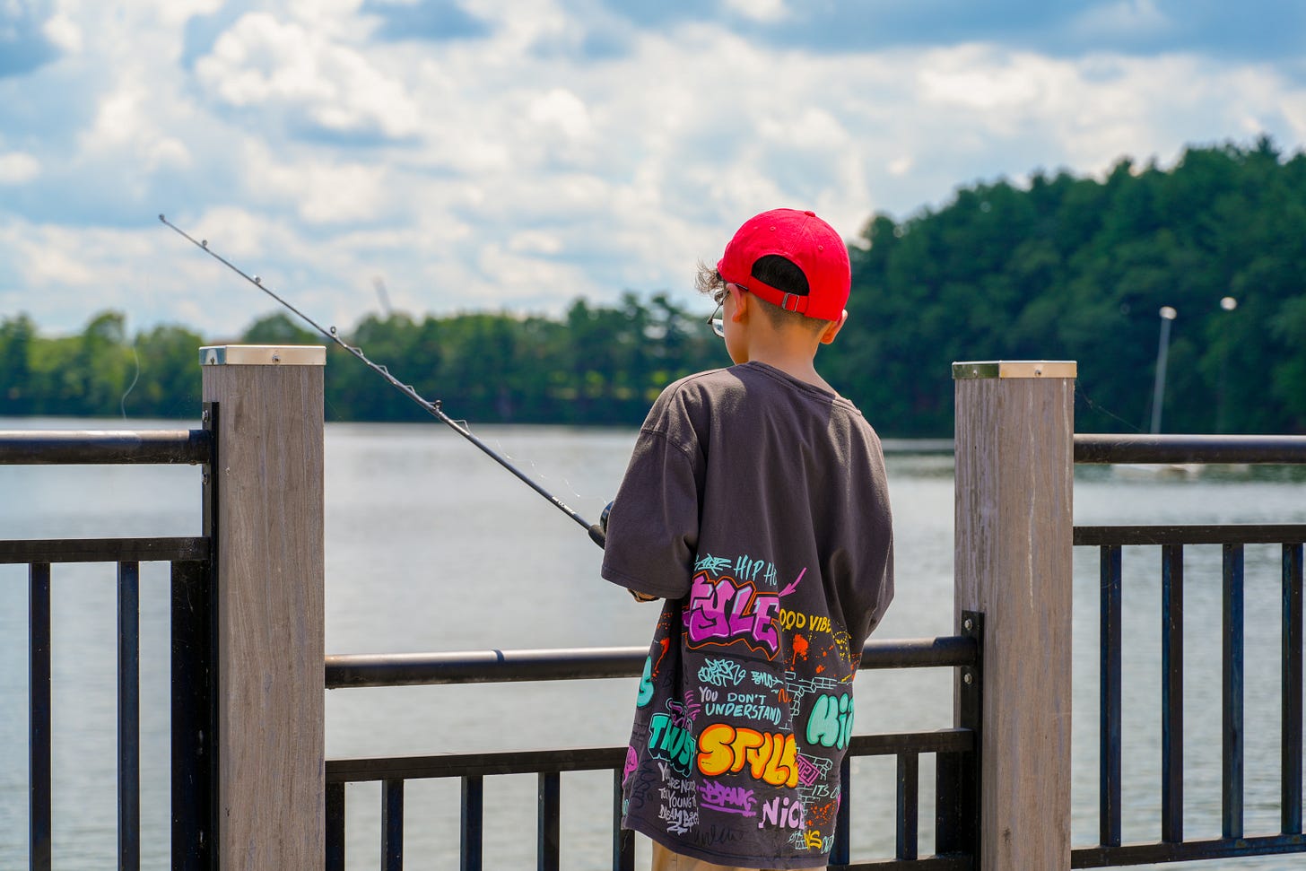 A boy stood up next, grinning as he playfully introduced himself as “Waddy Stryker.” The group burst into laughter, some shouting, “That’s not your name!” He held onto the joke for just a moment longer before grabbing the fishing rod and walking to the water’s edge. His first cast was shaky; the line tangled. But on his second try, he adjusted, his form steadier now. He looked over his shoulder, brought the tackle back, and swung it forward. The line arced cleanly through the air and landed in the lake with a soft splash. Then came the first catch of the day.