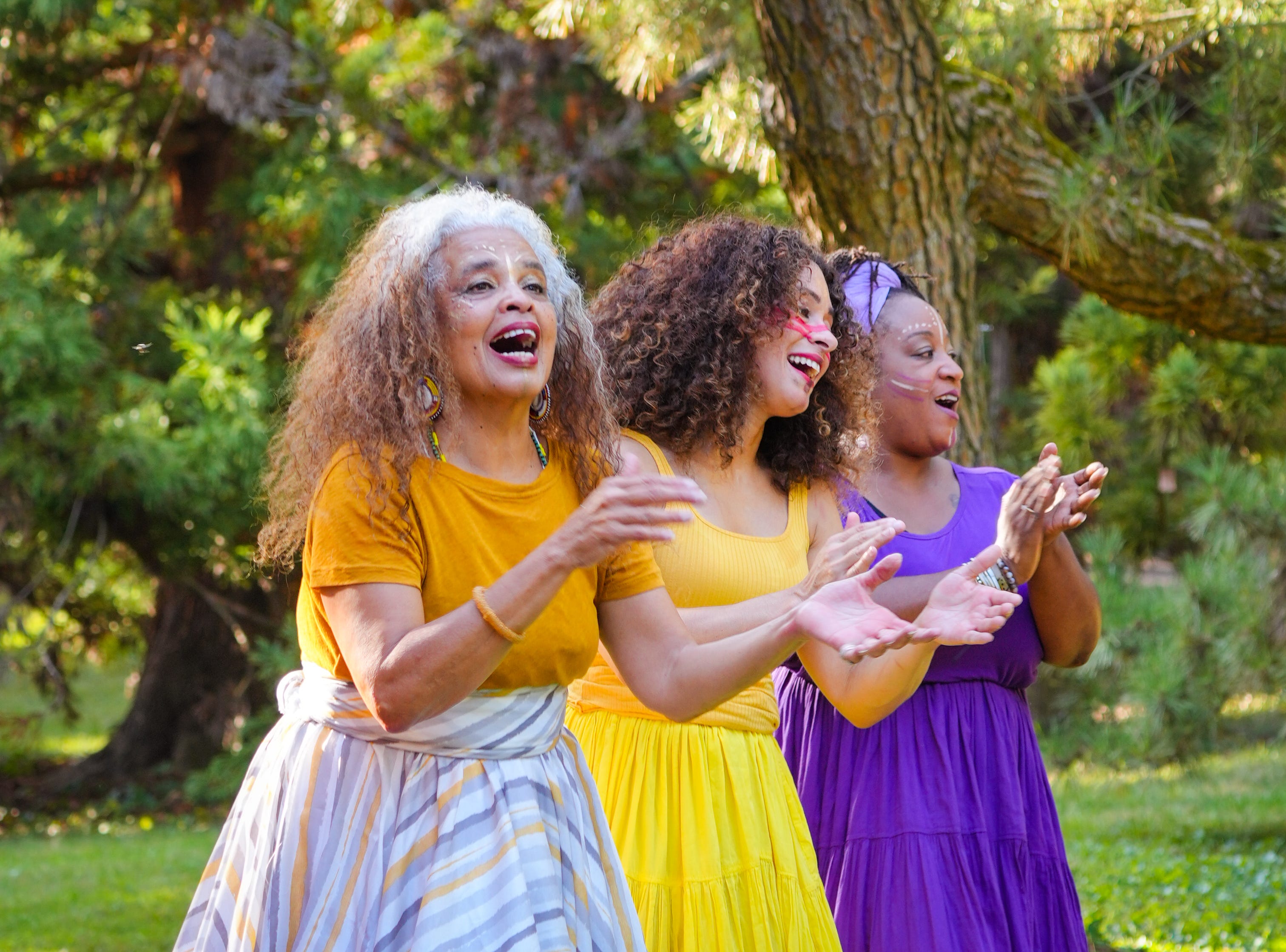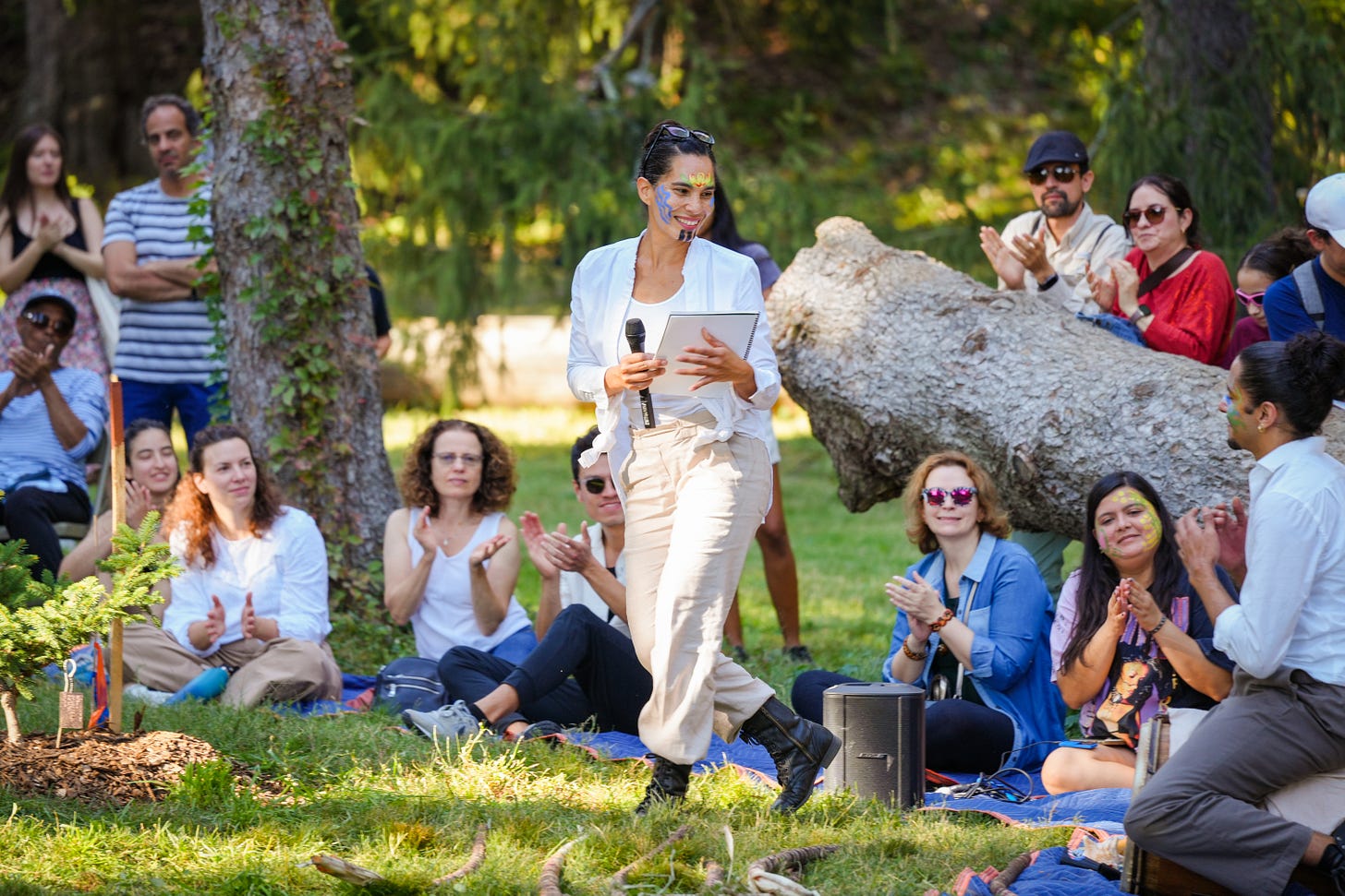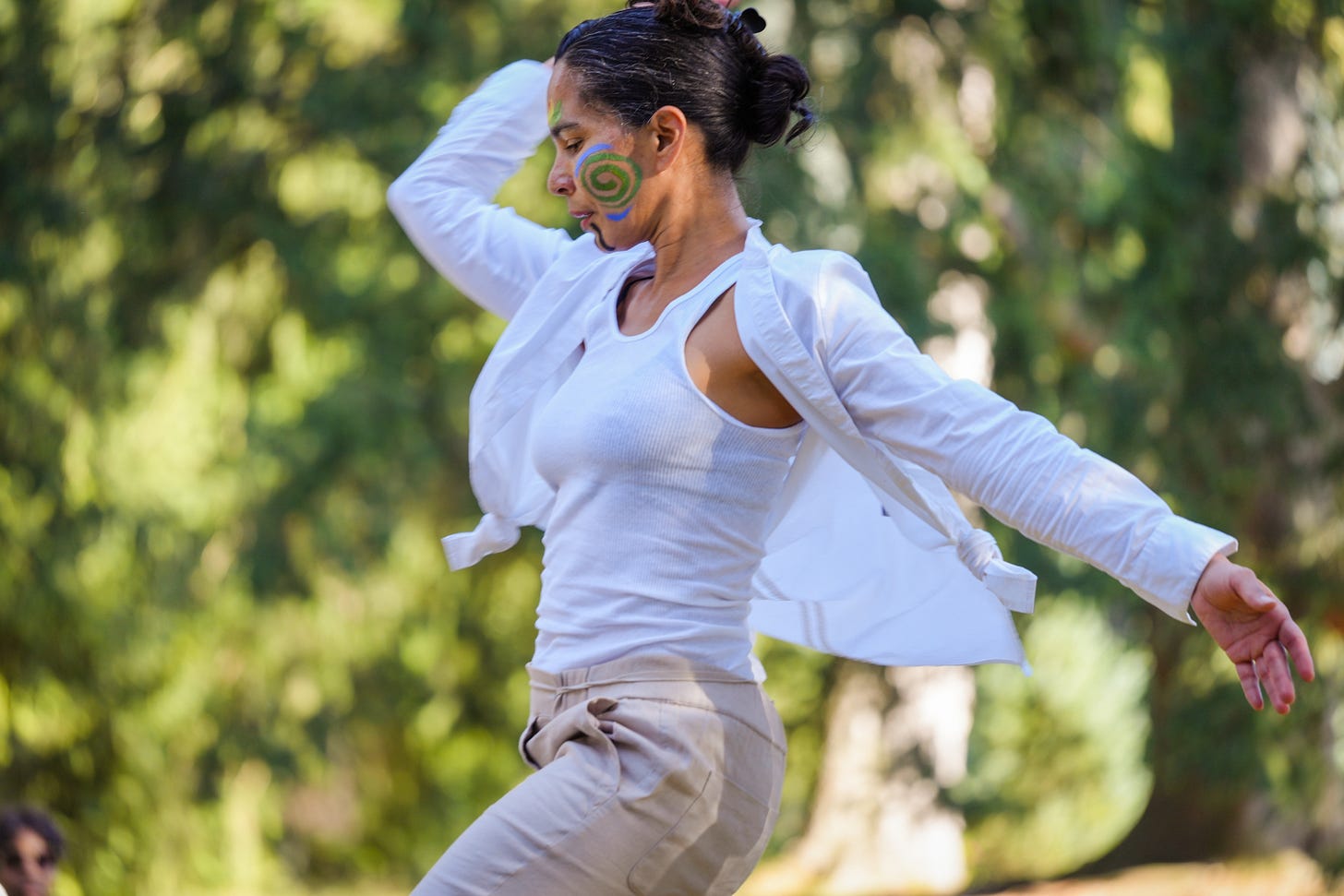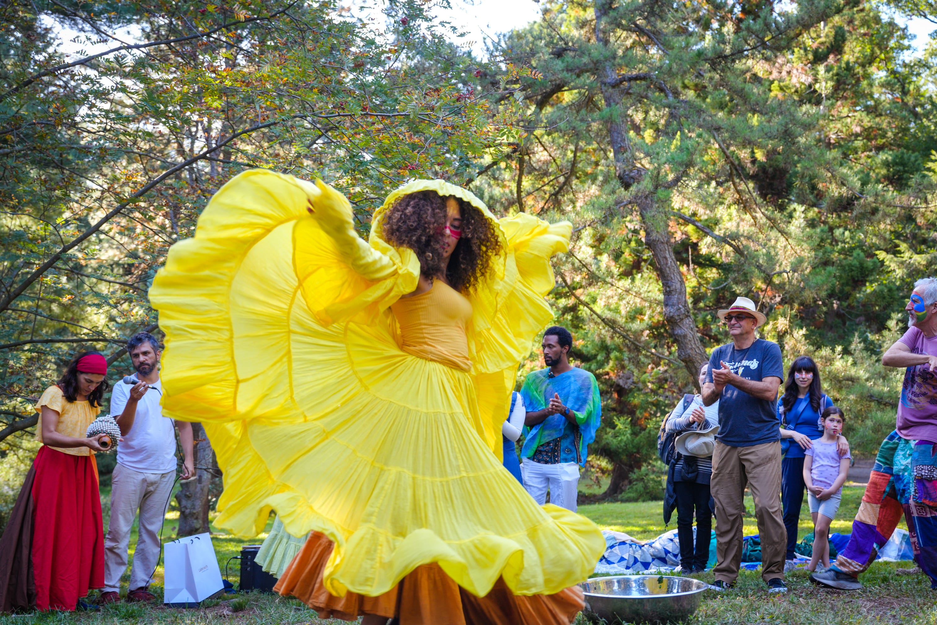 Not far from that circle, another colorful gathering formed. YABÁS, led by Isaura Oliveira, offered a healing ritual of Afro-Brazilian Orisha dance. Dancers twirled in vibrant skirts, water splashing as they moved with spirit and intention. Gourds shook, songs rose, and color pulsed across the grass. The performance was both art and ceremony. A blessing. A collective remembering.